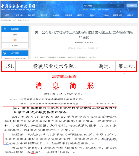 近日,教育部职业教育与成人教育司发布《关于公布现代学徒制第二批试点验收结果和第三批试点检查情况的通知》(教职成司函〔2019〕97号)公告信息,我院承担的教育部第二批学徒制试点项目(中药制药技术专业学徒制试点)通过终期验收,提交的学徒制试点典型案例《“三阶四岗五保障”协同育人,聚焦生产一线高素质技术技能人才培养》成功入选全国学徒制试点典型案例(陕西省试点院校唯一入选案例)。