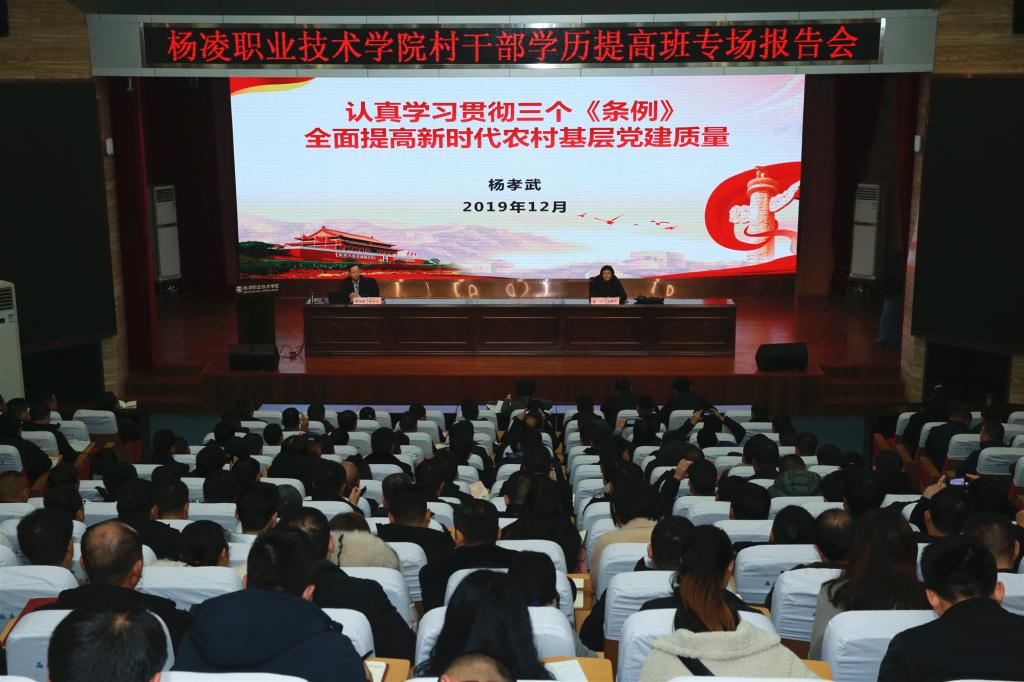 纪委书记刘粉莲,生物工程分院负责人,2017级、2018级杨凌村干部学历提升班学员、2019级全省村干部学历提升班学员等共300余人聆听了报告。