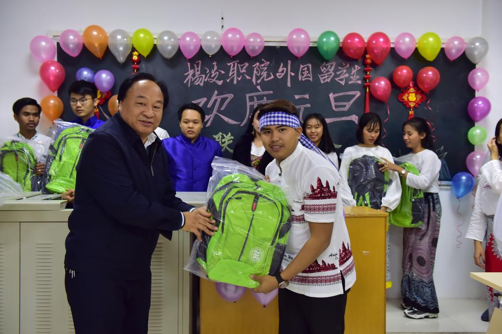 晚会开始前,王周锁首先代表学院向留学生们致以新年的问候和祝福,希望留学生们在2020年继续努力学习,学业有所进步,并为每位留学生赠送了书包作为新年礼物。