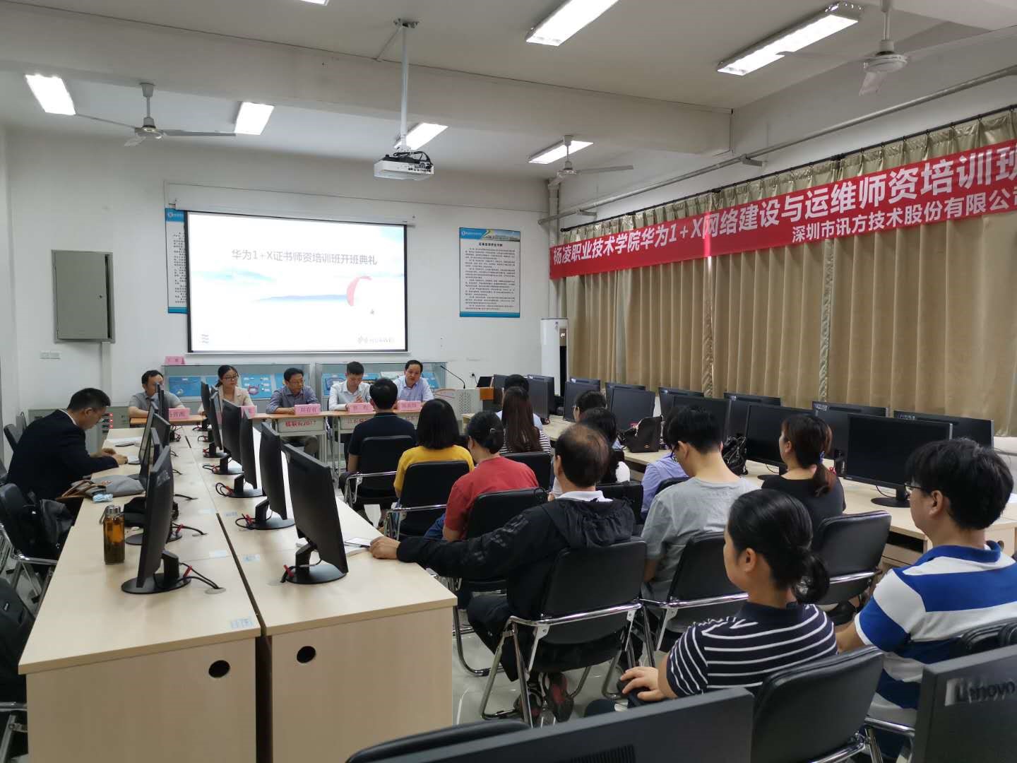 7月22-26日,陕西省首个“1+X”证书网络系统建设与运维培训班开班典礼在我院醒钟楼华为网络实训室举办。本次培训由华为技术有限公司主办,杨凌职业技术学院承办,西安讯方融云信息技术有限公司协办。来自西安航空职业技术学院、陕西职业技术学院和我院的10余名教师参加了培训。