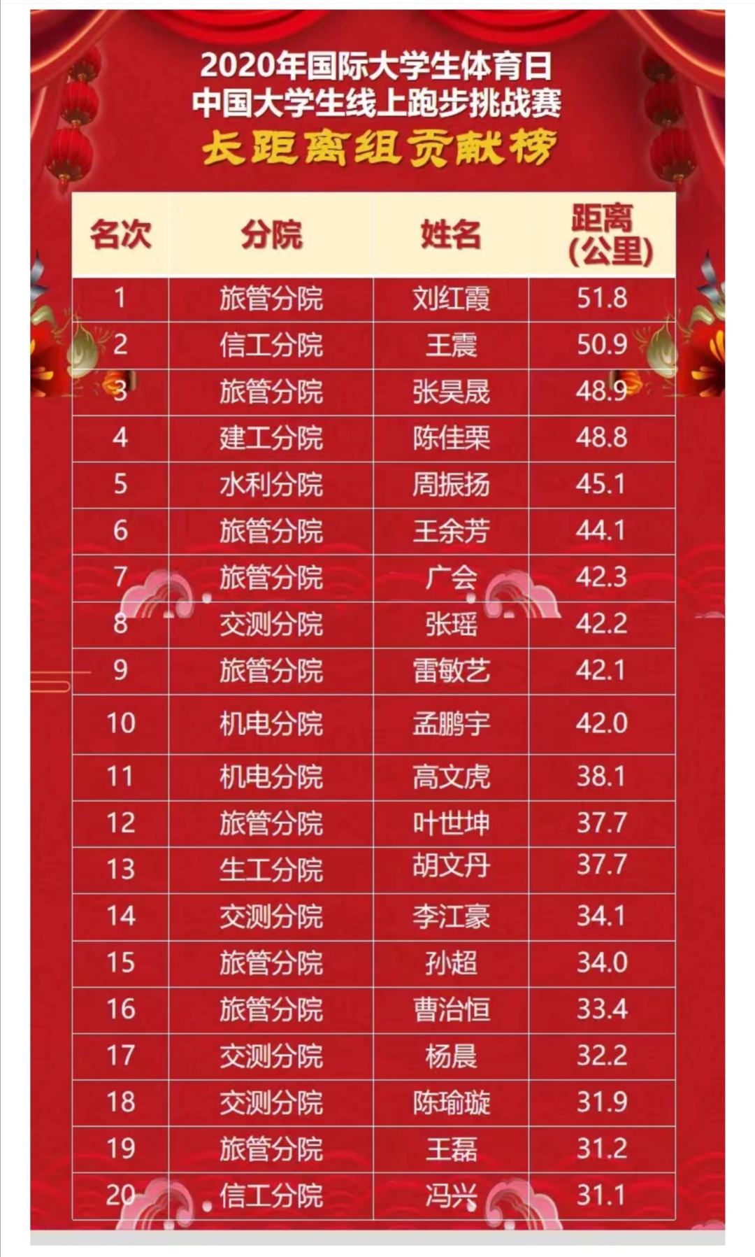9月18日到20日,中国大学生体育协会发起“2020年国际大学体育日·中国大学生线上跑步挑战赛”,我院在比赛中获得全国第十四名, 陕西高校排名第一,全国高职院校中排名第三。