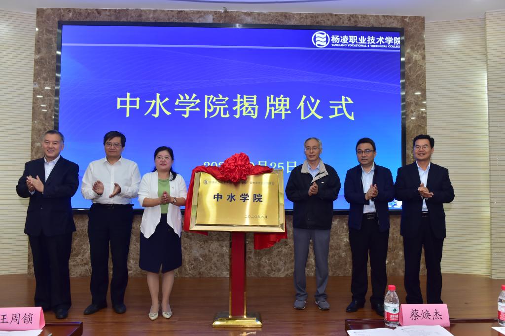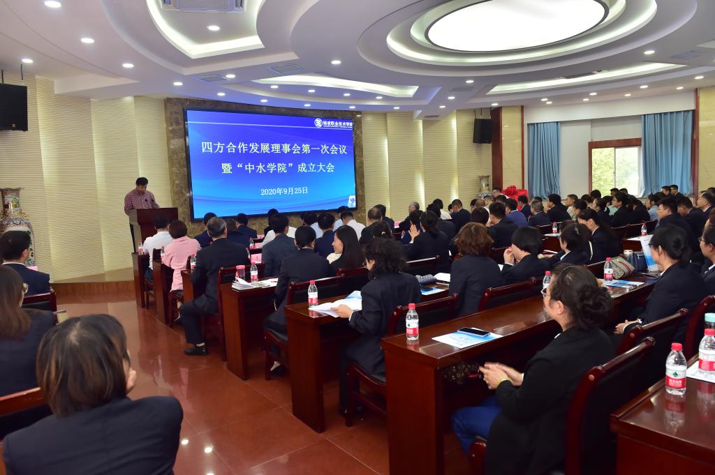 会上宣布了“中水学院”成立决定,“中水学院”领导机构为院长张迪、常务副院长郝红科、书记刘儒博、副院长周孝武、王国强、张卫宁、郭旭新。中水学院为水利工程专业群“政行企校”四方合作发展理事会成立的产业学院,为今后的水利工程分院、海外分院、企业学院等培养高水平技术技能人才,为企业提供高水平技术技能服务奠定基础。随后,政、行、企、校、代表共同为中水学院揭牌,会议签订了校政、校企合作协议,为6家企业颁发了产教融合实训基地牌,聘请了全国水利首席技师王战义为技能导师,聘任蔡焕杰、胡笑涛、闫星、贺群为客座教授,聘任张卫宁、吴学庆、任铁牛、王拴定、许荣辉为产业教授,12家企业向学院授“人才培养基地”牌。
