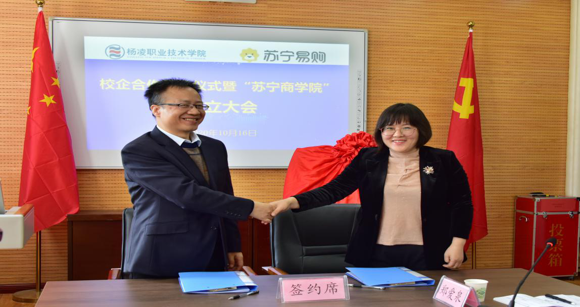 10月16日下午,我校与苏宁易购集团校企合作签约仪式暨“苏宁商学院”成立大会在经济与贸易分院举行。学校党委副书记、纪委书记刘粉莲,学校党委委员、教务处处长拜存有,经济与贸易分院党总支书记李嘉鸣、副院长杨宏祥,陕西苏宁易购销售有限公司总经理程峰,苏宁易购西安大区物流公司总经理雷宏波、电器店运营中心总监肖强、人力资源中心总监杨花,及分院全体教师共40余人参加成立大会。大会由产教融合处副处长郑爱泉主持。