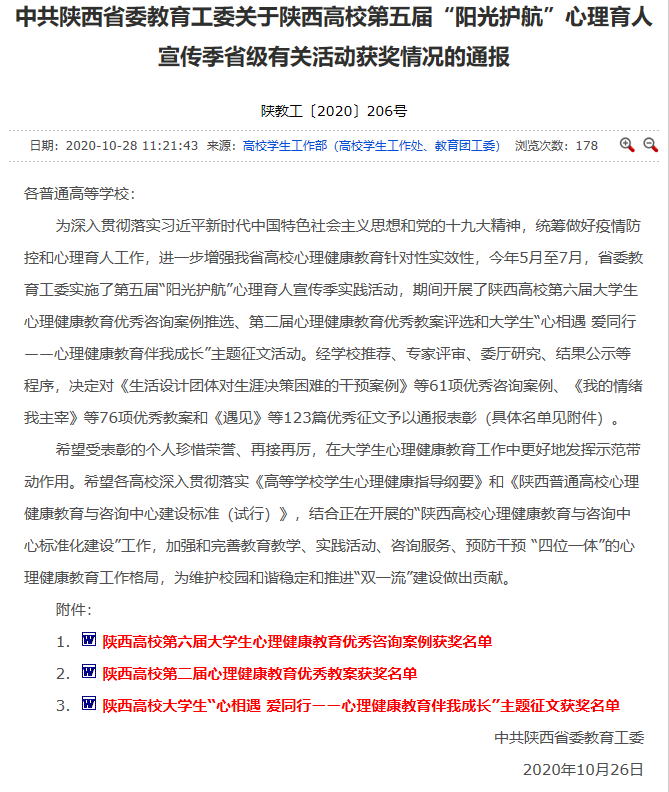 据悉,陕西高校第五届“阳光护航”心理育人宣传季实践活动开展以来,我院积极组织师生参与了大学生心理健康教育优秀咨询案例推选、优秀教案评选和主题征文活动等。学院大学生心理健康教育与咨询中心也以此次活动为契机,认真贯彻落实中、省有关精神,统筹做好学院疫情防控和心理育人工作,扎实做好心理健康教育与咨询工作,不断提升心理育人水平。