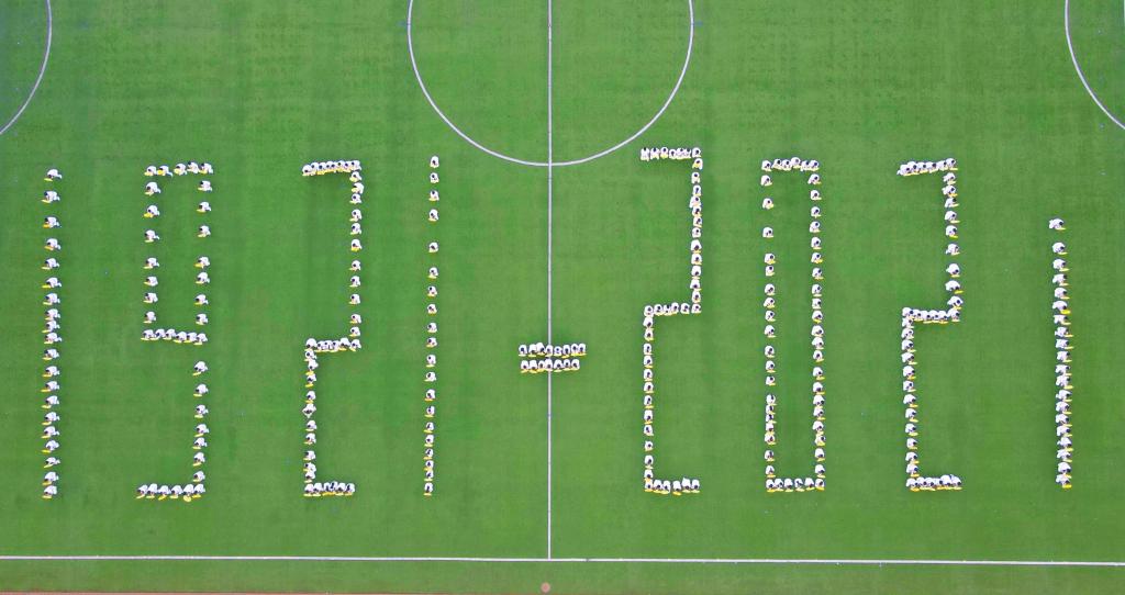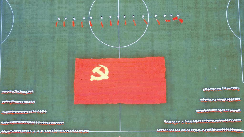 今年是中国共产党成立100周年,由体育课教学部组织编排、600名学生表演的大型团体操“风雨百年”,表达了全校师生对党和祖国的热爱。团体操分为感谢有你、风雨百年、党旗颂三个篇章,600名学生踏着音乐节拍,组合出1921-2021、党旗等造型,赢得现场掌声、欢呼声不断。