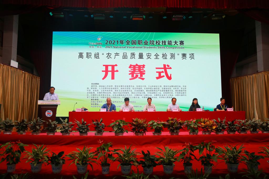 全国供销合作职业教育教学指导委员会常务副秘书长聂云杰宣布2021年全国职业院校技能大赛(高职组)“农产品质量安全检测”赛项正式开赛。杨凌示范区党工委委员、组织部部长田晓炜,陕西分赛区执行委员会副主任、陕西省教育厅职成处副处长周杰,我校党委书记陈宁分别致辞。赛项执委会委员、我校校长王周锁主持开赛仪式。