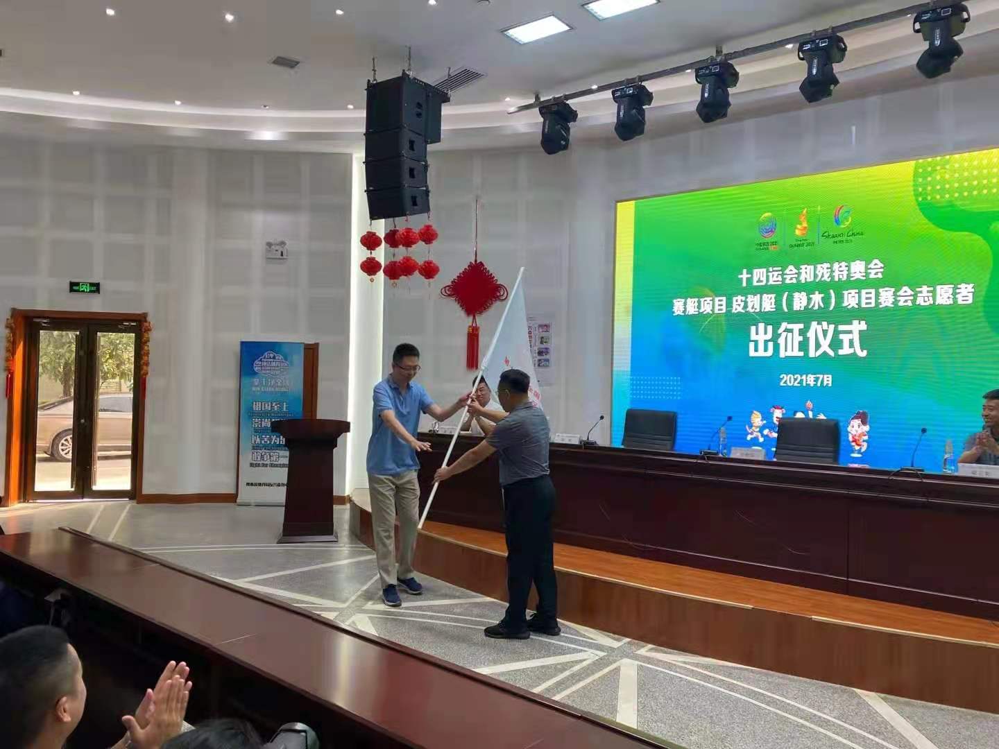7月4日,十四运会和残特奥会赛艇、皮划艇(静水)项目志愿者出征仪式在省水上运动管理中心举行。校团委书记陈吼代表我校志愿者服务队接旗。