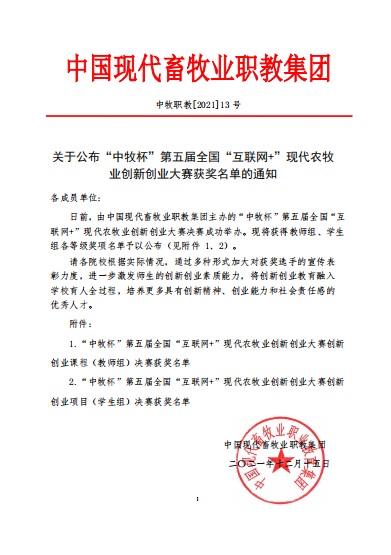 近日,在中国现代畜牧业职教集团主办的“中牧杯”第五届全国“互联网+”现代农牧业创新创业大赛决赛中,我校荣获一等奖1项,二等奖1项,三等奖2项。