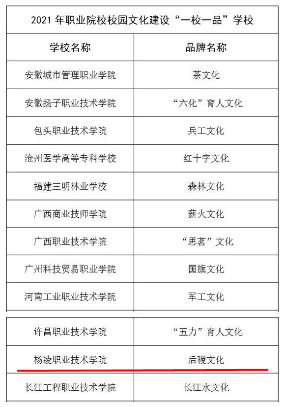 1月4日,教育部职业院校文化素质教育指导委员会公布了2021年全国职业院校校园文化建设“一校一品”申报结果,我校“后稷文化”品牌成功入选。学校荣获全国职业院校校园文化“一校一品”学校称号。