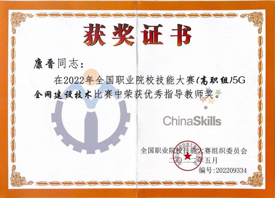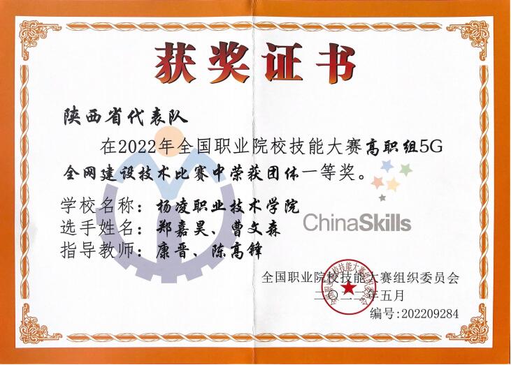 8月22日至23日,2022年全国职业院校技能大赛高职组“5G全网建设技术”赛项在济南职业学院举办,来自全国28个省、56支代表队、112名选手参加了比赛。经过8个小时的激烈比拼,我校信息工程学院学生郑嘉昊、曹文森以总分排名全国第一的成绩,荣获一等奖第一名,取得我校自参赛以来历史最好成绩,指导教师康晋、陈高锋荣获大赛优秀指导教师奖。