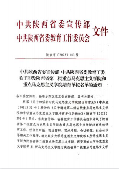 近日,省委宣传部、省委教育工委公布了陕西省第二批重点马克思主义学院和重点马克思主义学院培育单位名单,我校马克思主义学院被确定为陕西省第二批重点马克思主义学院培育单位。