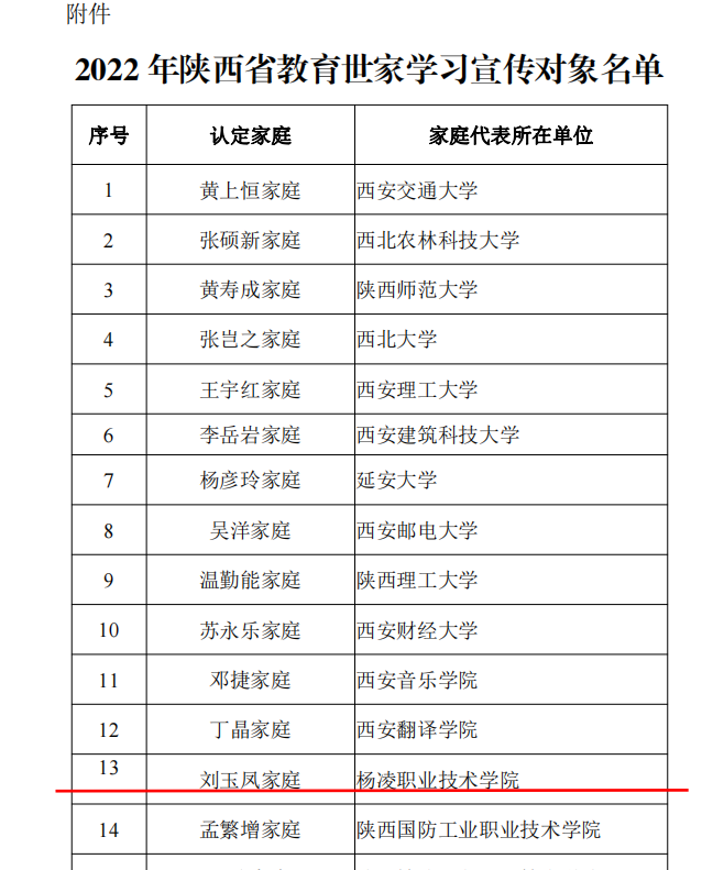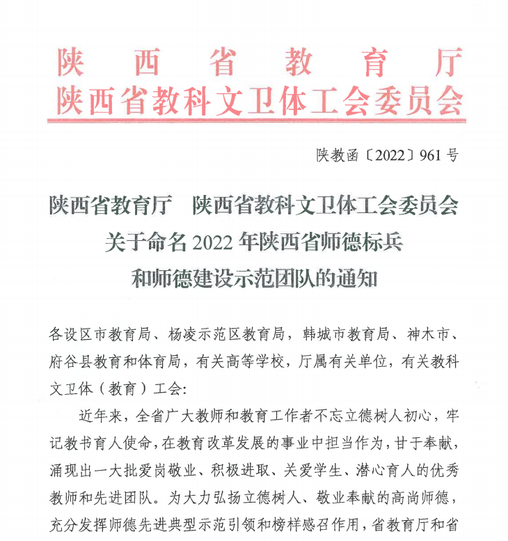 近日,陕西省教育厅、陕西省教科文卫体工会委员会联合发文,公布2022年陕西省师德标兵、师德建设示范团队、黄大年式教师团队和陕西省教育世家名单。我校水利工程学院赵英老师获评陕西省师德标兵,生物工程学院被命名为陕西省师德建设示范团队,动物工程学院畜牧兽医教师团队入选陕西省高校黄大年式教师团队,药物与化工学院刘玉凤家庭获陕西省教育世家荣誉称号。