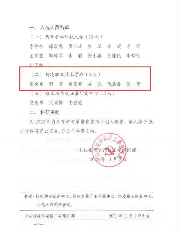 11月3日,杨凌示范区召开青年育种专家座谈会,宣布2022年青年育种专家培育支持计划入选名单,我校侯金星、贾燕青、黎雪、仇薪鑫、吴宽、张雯等6人入选2022年青年育种专家培育支持计划。副校长胡俊鹏出席座谈会,张雯、侯金星代表入选人员做表态发言。