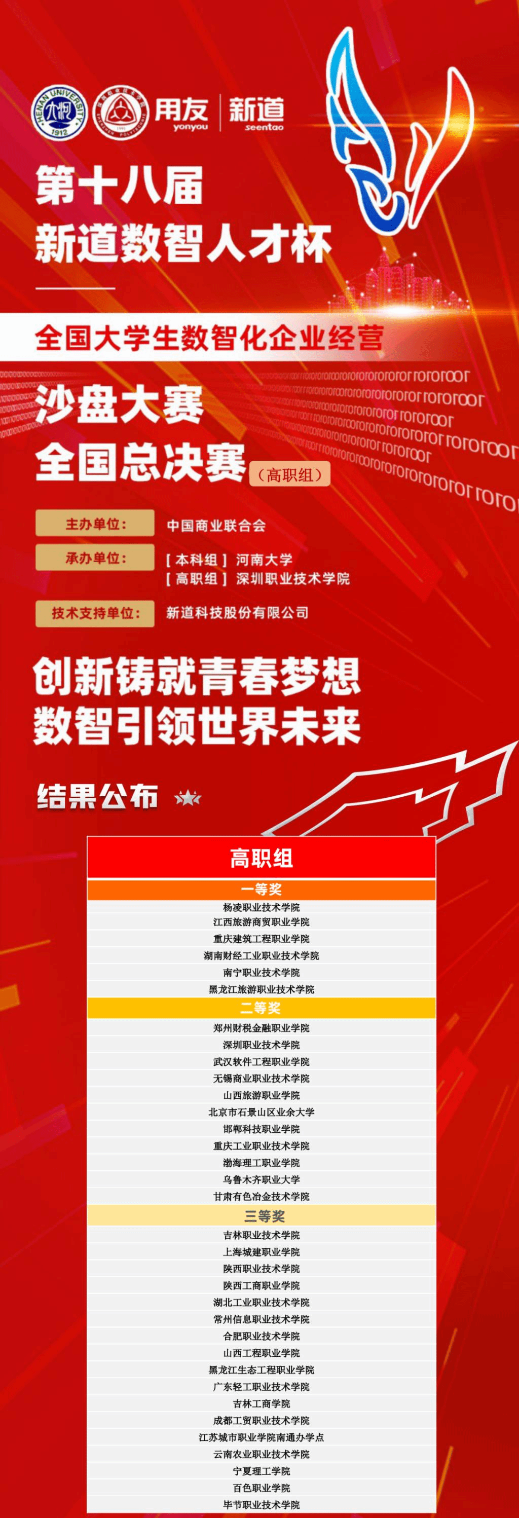 11月12日,第十八届“新道数智人才杯”全国大学生数智化企业经营沙盘大赛全国总决赛(高职组)圆满结束,经过一天的激烈的角逐,我校经济与贸易学院学生王家乐、刘虹池、鲁文杰、冯迎亮组成的参赛队以第一名的优异成绩荣获全国总决赛一等奖,这是我校在此赛项上取得的历史最好成绩。