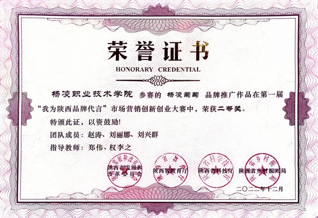 本次比赛主题为“推广农业品牌,助力乡村振兴”,由省发展和改革委员会主办,品牌和高质量发展研究中心、西安理工大学联合承办,省委宣传部、省教育厅、省科技厅、省农业农村厅、省乡村振兴局等多部门指导。共有来自全省30余所高校的300支队伍、3000名学生参加。我校“秦拾味”团队以杨凌葡萄为选题,从5月至10月历经2个阶段赛事活动,最终取得二等奖第1名的好成绩,也是陕西高职院校中最高获奖学校。