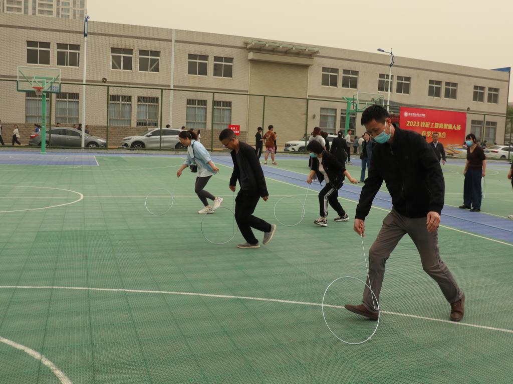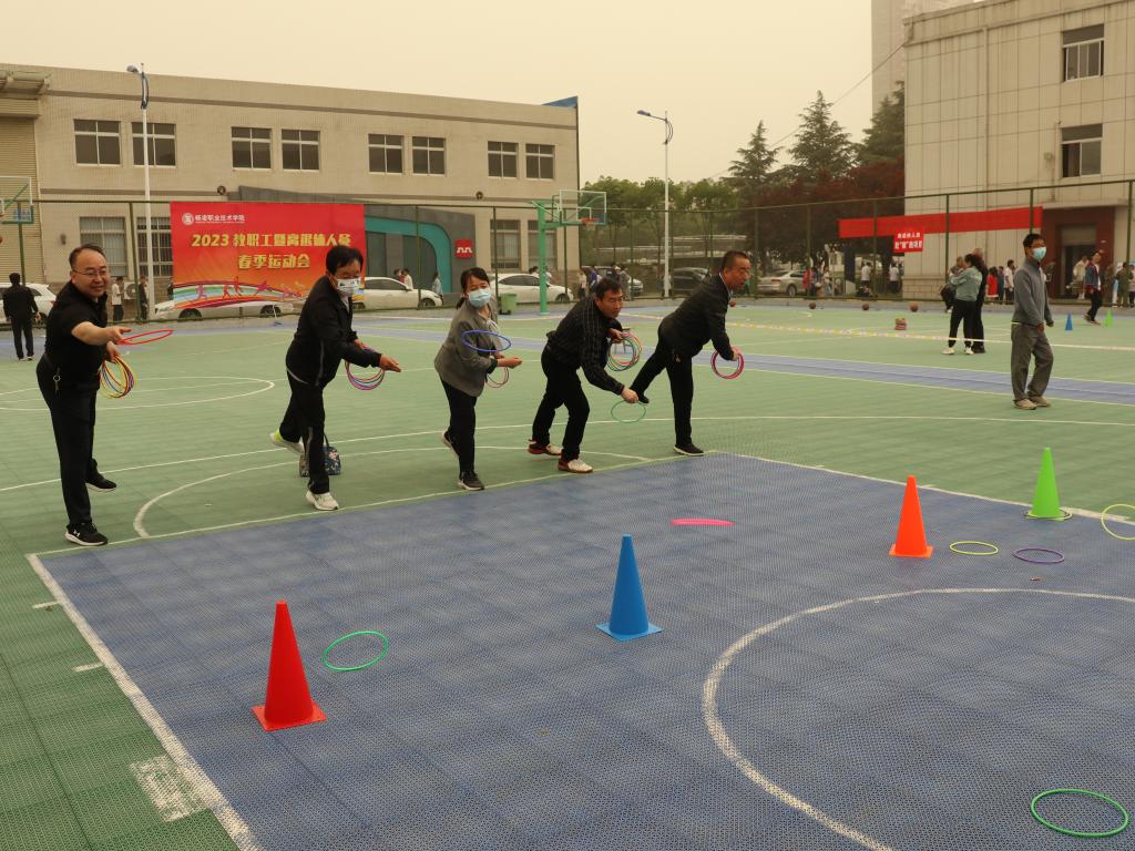 趣味项目中,教职工们本着轻竞技、重参与、重安全的原则,在欢声笑语中参与了运动。滚铁环、跳绳让教职工找回了童年的乐趣,定点投篮、套圈让教职工在稳、准动作中体验了中奖的快乐,赶“猪”跑和“筷”运乒乓球让离退休职工体验了赶“猪”人和“搬运工”的快乐。
