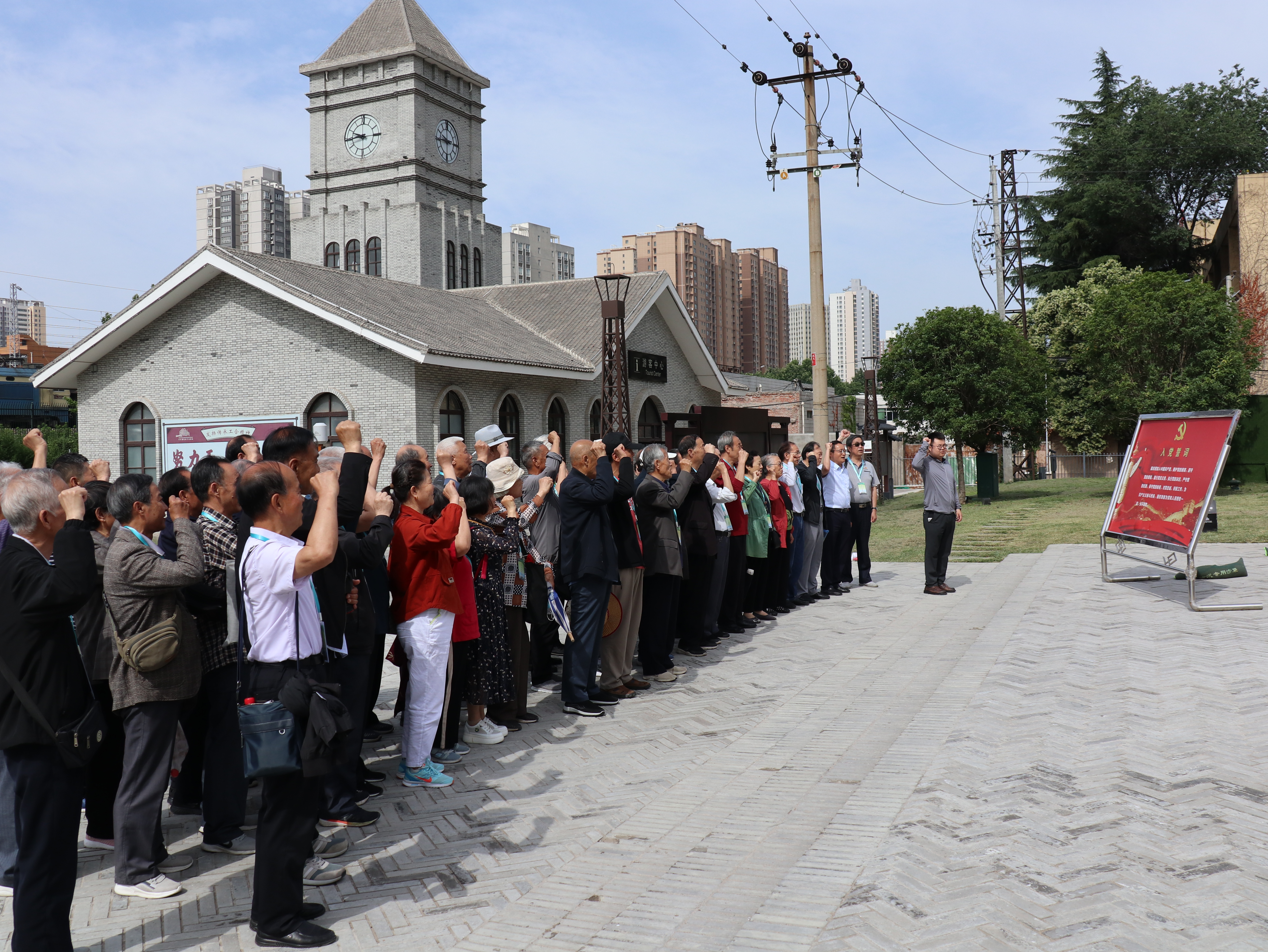 参观中,大家认真聆听讲解,驻足观看,从全国最大的窑洞车间到中西合璧的申新办公楼、乐农别墅、双曲拱结构薄壳车间,通过留存的珍贵照片、实物,详细了解抗战时期申新纱场西迁的历史,见证了民族工业的发展历程,深刻感悟革命先辈不畏生死、艰苦奋斗的革命斗争精神,以及在战争年代为革命解放事业做出的伟大贡献。活动中,党员同志重温了入党誓词,歌唱《没有共产党就没有新中国》。
