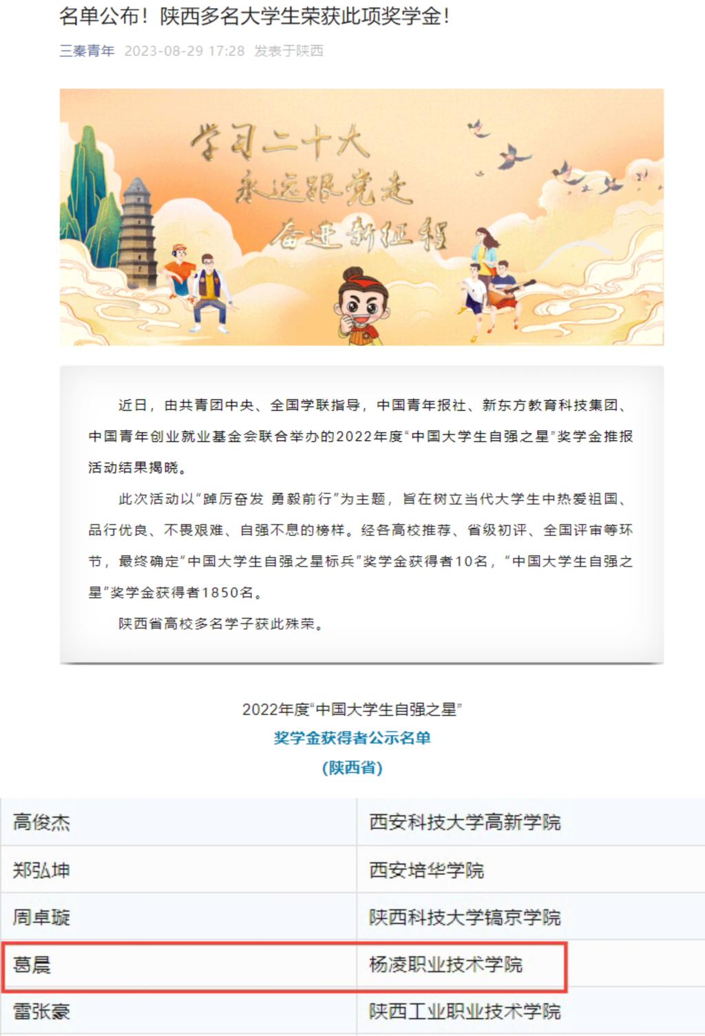 近日,由共青团中央、全国学联指导,中国青年报社、新东方教育科技集团、中国青年创业就业基金会联合举办的2022年度“中国大学生自强之星”奖学金推报活动结果揭晓,我校水利工程学院学生葛晨荣获2022年度“中国大学生自强之星”称号。