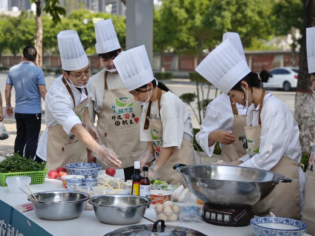 品鉴活动设置“科技创新体验组”、“国际合作体验组”、“乡村振兴体验组”、“示范推广体验组”等四个组别,参赛选手中有高校师生、有社区居民、有蘸水面商家,杨职代表队参加的是“示范推广体验组”。活动中,我校师生把一块块面团,通过揉、擀、扯、甩的手法,加工成又宽又长、又薄又劲道的面条,大家配合默契、技术到位、分工明确,完美展现了我校学生的风采。