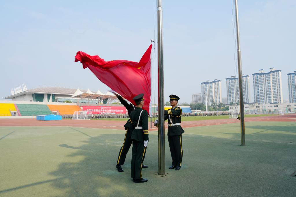 9月9日上午9时,学校2024级新生开学典礼暨军训动员大会在雄壮的国歌声中拉开序幕。党委书记韩明军宣布2024级新生开学典礼暨军训动员大会开始,并向军训团授旗,校长仲伟周作军训动员讲话,本次军训团团长周鹏华讲话。大会由副校长祝战斌主持。