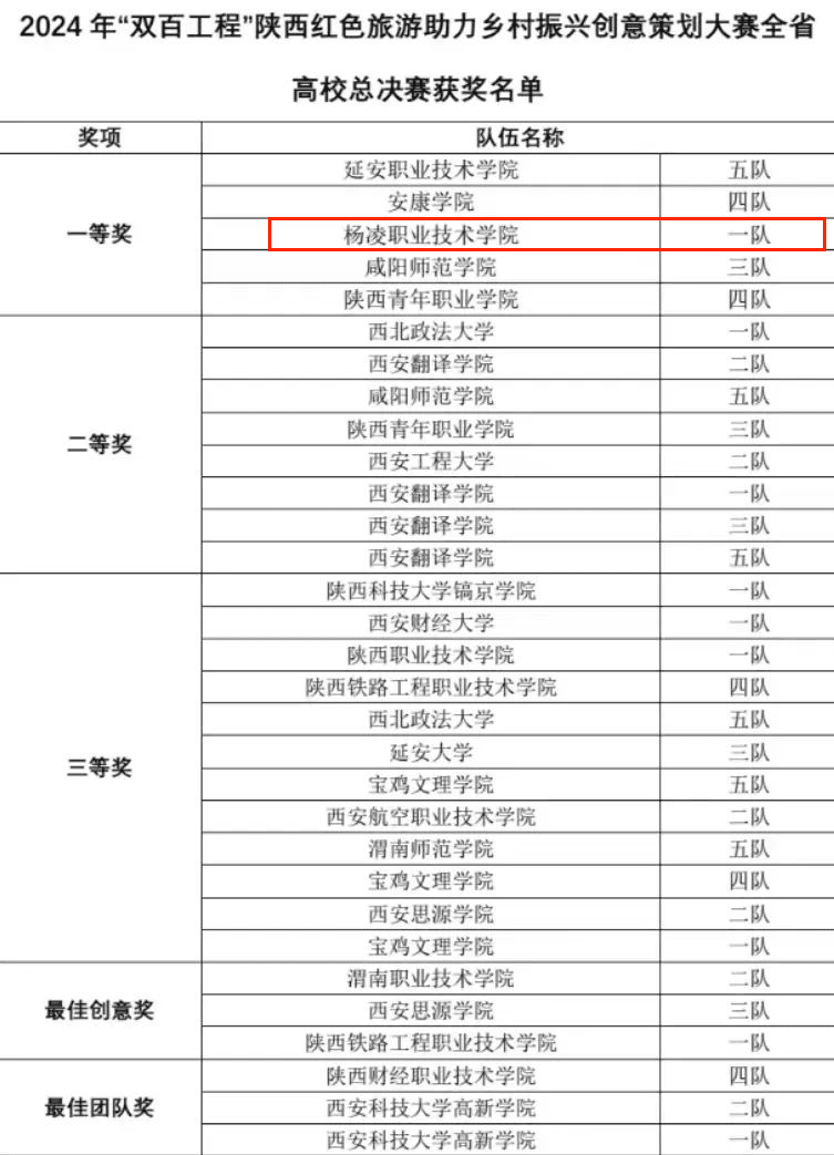 11月10日,2024年“双百工程”陕西红色旅游助力乡村振兴创意策划大赛总决赛在西北政法大学长安校区举行。来自全省64所高校的211支队伍参加大赛,经过校级预选赛、省级初赛层层选拔,前期评审、项目路演、现场答辩激烈角逐,由我校旅游与管理学院刘洁、张梦悦老师指导,张静楠、张彩风、朱宇姣、李帅、田睿卓尔5名学生组成的杨凌职院一队,以《陈炉传薪火,初心“印”千秋——新时代印台红旅样板》为作品参赛,荣获决赛一等奖。