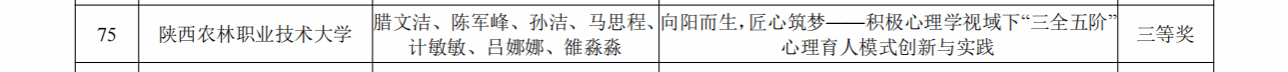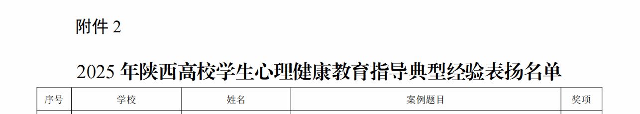 在2025年陕西高校学生心理健康教育指导典型经验评选中,《“文心乐树”:传统文化艺术疗愈助力高校学生心理健康教育实践经验》获一等奖,《解构·重组·进化——“5E·四维联动”心理育人体系赋能大学生心理健康的实践经验》获二等奖。在2025年陕西高校学生心理健康教育指导典型案例评选中,《向阳而生,匠心筑梦——积极心理学视域下“三全五阶”心理育人模式创新与实践》获三等奖。在第六届陕西高校校园心理情景剧活动中,参赛作品《逆风》获三等奖;学生在第七届陕西高校大学生心理健康科普知识竞赛活动中获优秀奖。