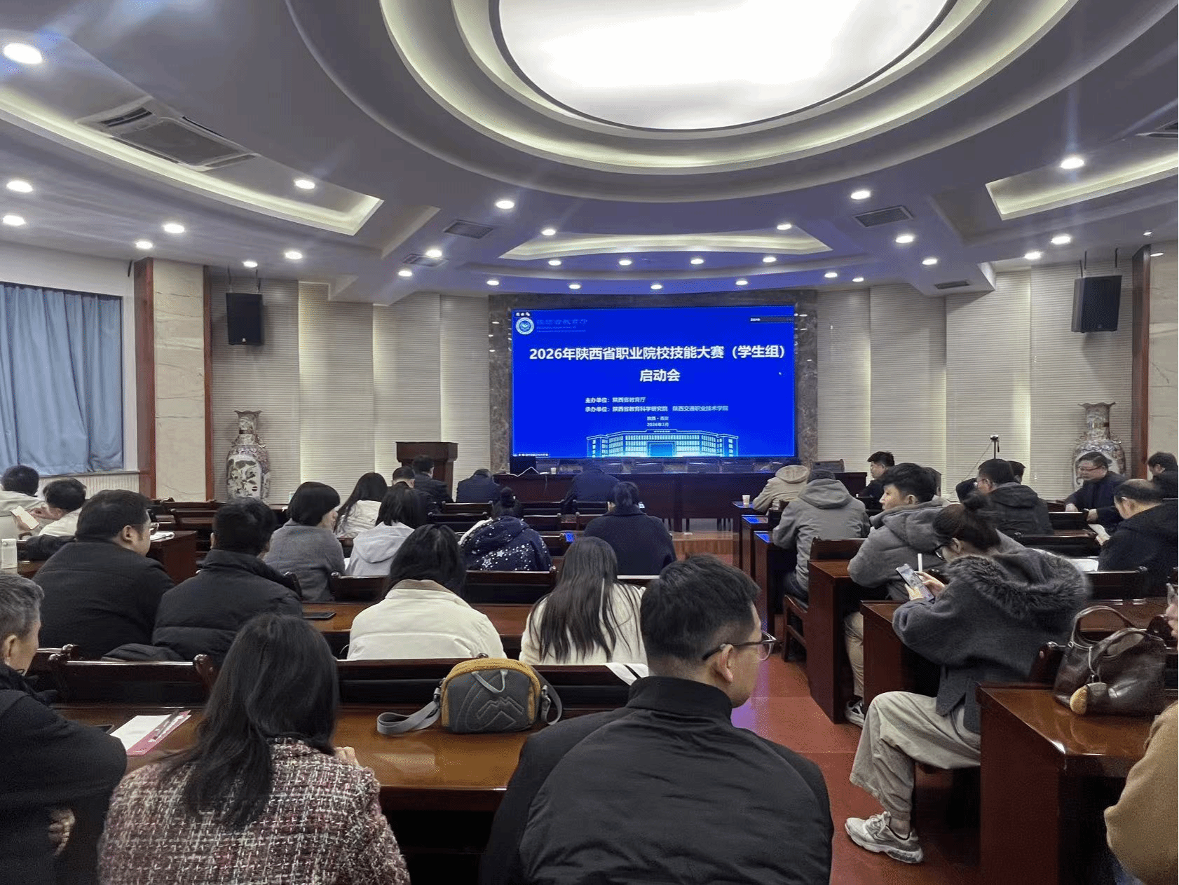 3月13日下午,2026年陕西省职业院校技能大赛(学生组)启动会召开。我校副校长祝战斌、教务处负责人在线下主会场参会,各学院分管技能大赛工作的处科级干部、参赛团队指导教师及教务处相关人员70余人线上同步参会。