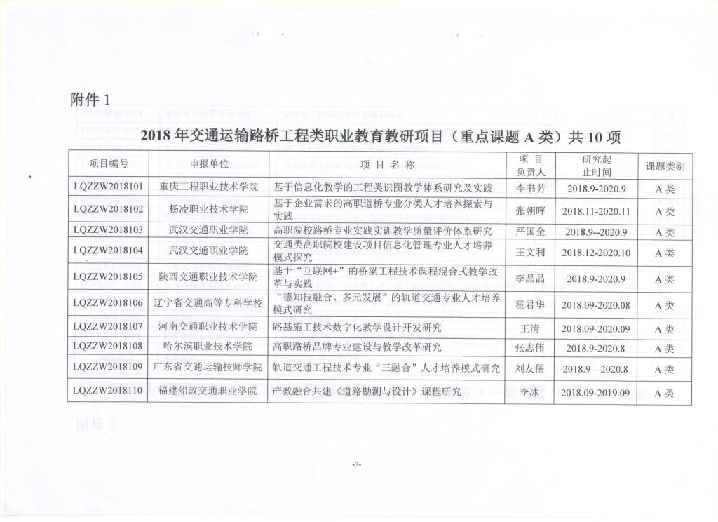近日,全国交通运输职业教育教学指导委员会公布了路桥工程类专业指导委员会2018年教研课题立项名单。我院张朝晖副教授负责的《基于企业需求的高职道桥专业分类人才培养探索与实践》项目,入选2018年交通运输路桥工程类职业教育教研项目(重点课题A类)。