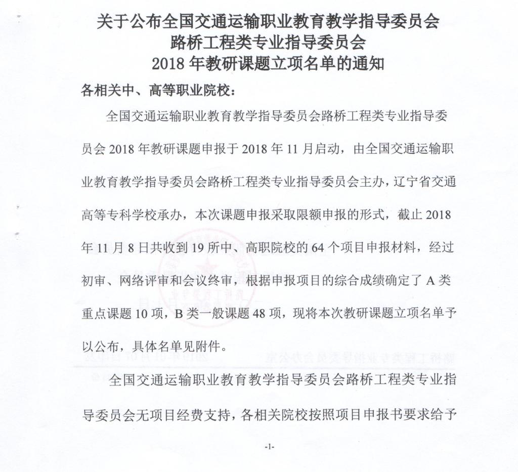 全国交通运输职业教育教学指导委员会路桥工程类专业指导委员会2018年教研课题申报于2018年11月启动,由全国交通运输职业教育教学指导委员会路桥工程类专业指导委员会主办,采取限额申报的形式。截止2018年11月8日,委员会共收到19所中高职院校的64个项目申报材料,经过初审、网络评审和会议终审,根据申报项目的综合成绩确定了A类重点课题10项、B类一般课题48项。
