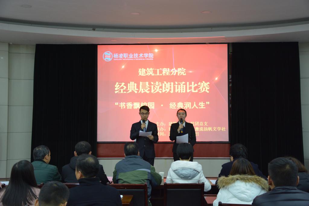 为贯彻落实全国高校思想政治工作会议精神,用中华优秀经典文化教育培养、感染熏陶学生,近日,建筑工程分院在南校区水韵楼报告厅举办了“书香飘校园·经典润人生”经典晨读朗诵赛。