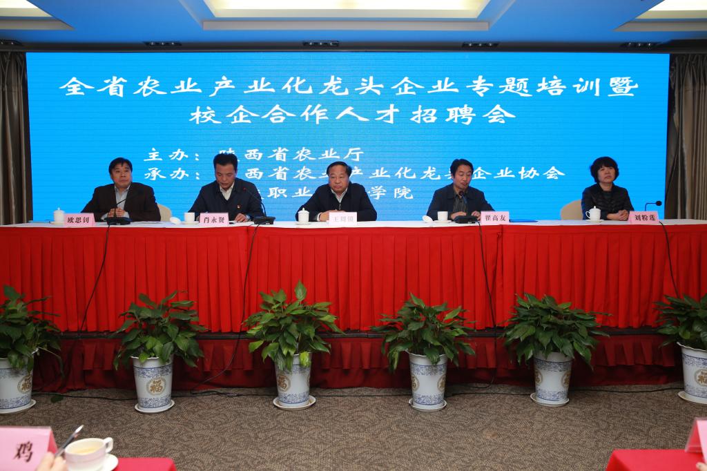 11月21日,由陕西省农业厅主办,我院和陕西省农业产业化龙头企业协会承办的全省农业产业化龙头企业专题培训暨校企合作人才招聘会在我院举行。我院院长王周锁,纪委书记刘粉莲,党委委员、教务处处长张宏辉,农业厅产业化处处长翟高友,示范区农业局局长肖永贤,以及我院招生就业处、生物工程分院负责人参加了招聘会开幕式。