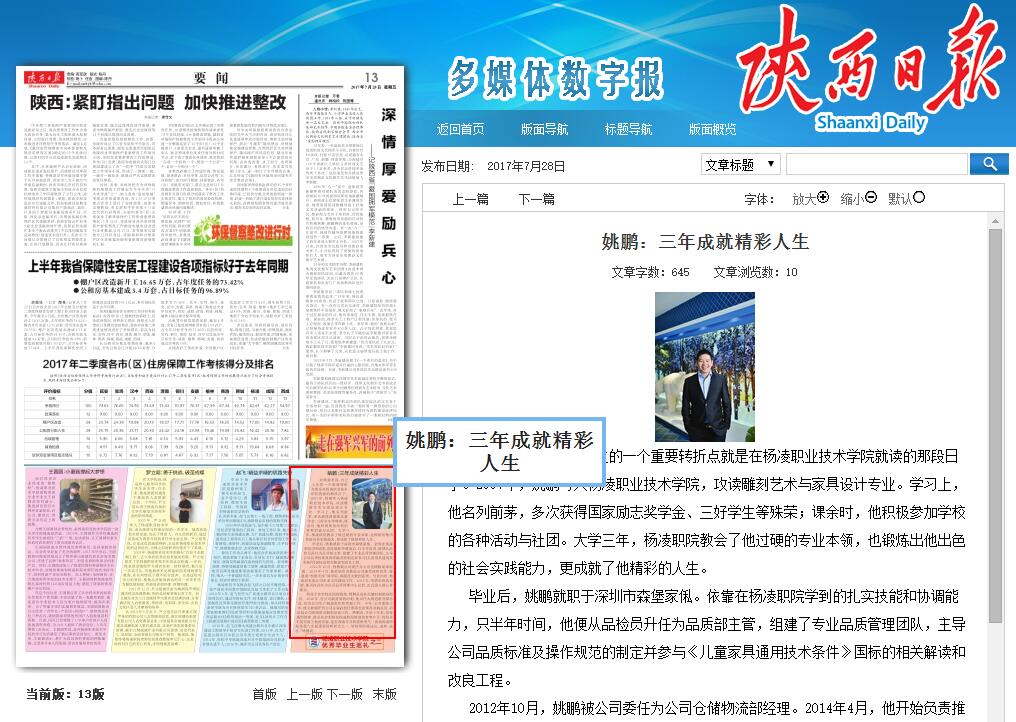 毕业后,姚鹏就职于深圳市森堡家俬。依靠在杨凌职院学到的扎实技能和协调能力,只半年时间,他便从品检员升任为品质部主管,组建了专业品质管理团队,主导公司品质标准及操作规范的制定并参与《儿童家具通用技术条件》国标的相关解读和改良工程。