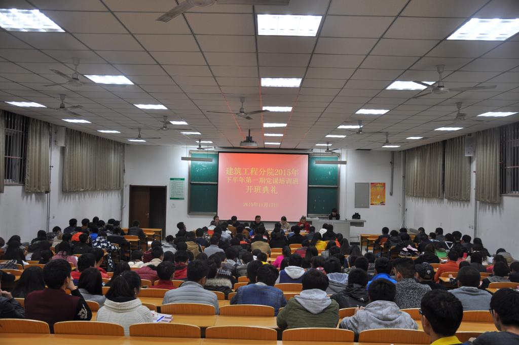 按照学院党校关于党课培训的统一部署,建筑工程分院党总支精心筹划,认真准备, 11月17日晚,伴随雄壮的国歌声,建筑工程分院2015年下半年第一期大学生党课培训班开班仪式着在南校区N0B105台阶教室举行。分院党总支委员、党支部委员和教师党员代表及全体学员共200余人参加了开班典礼。