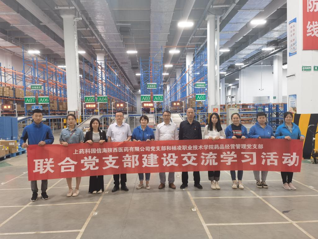在上药陕西公司,药营支部党员参观考察了上药陕西公司物流中心和公司陕西DTP药房,了解了物流中心的规模、运作流程、管理理念,以及上药科园陕西DTP药房的发展、管理、服务等情况,随行党员结合专业建设、课程内容、教学实训、毕业生就业等进行了交流。