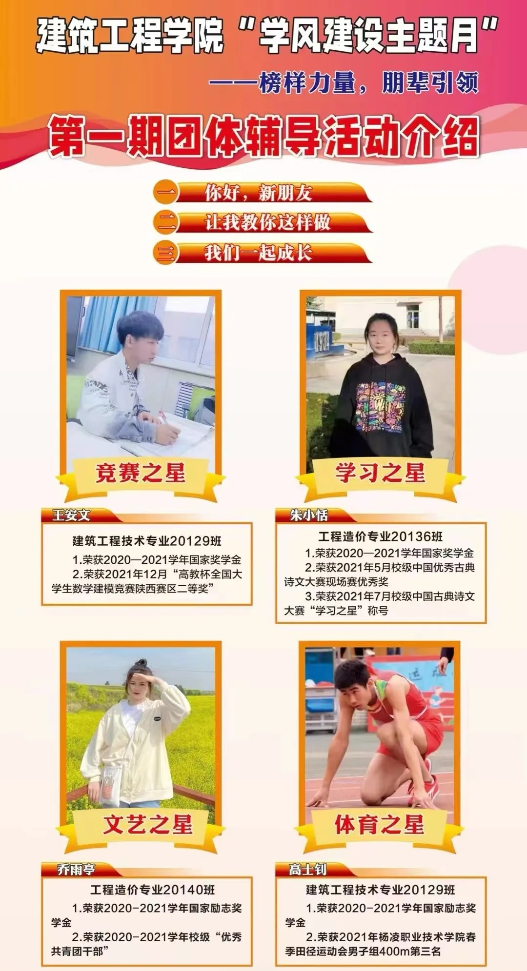 ——创新工作内容,全面助力学风。组织开展了第一期“榜样力量,朋辈引领”团体辅导活动。内容分为“你好,新朋友”“让我教你这样做”以及“我们一起成长”三节小组活动,发挥团体辅导体验式、参与式、主动式、合作式的方式,助力学风建设新气象,激发学生的学习兴趣,养成良好的学习习惯,达到了预期效果。