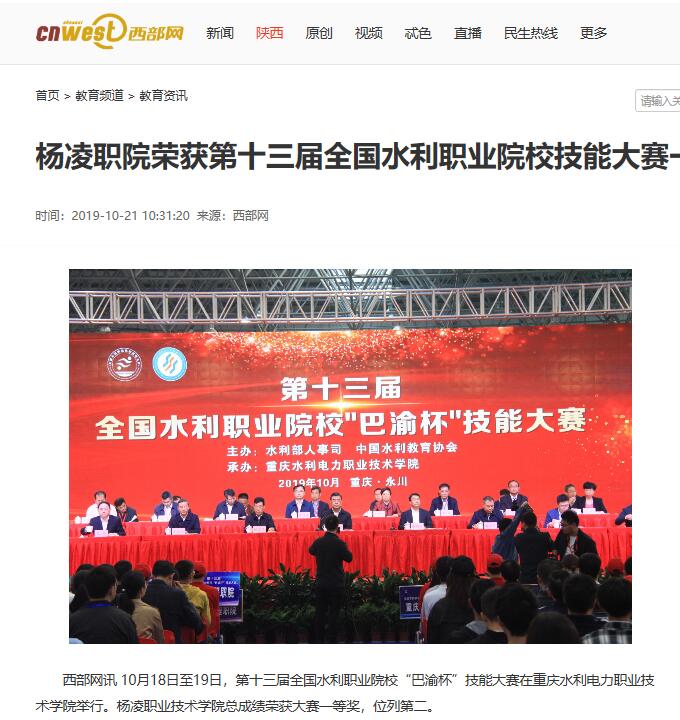 西部网讯 10月18日至19日,第十三届全国水利职业院校“巴渝杯”技能大赛在重庆水利电力职业技术学院举行。杨凌职业技术学院总成绩荣获大赛一等奖,位列第二。