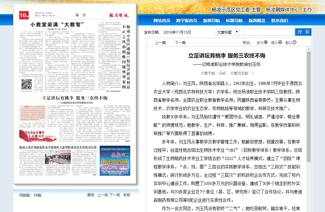 人物简介:刘玉凤,陕西省合阳县人,1962年出生,1986年7月毕业于原西北农业大学(现西北农林科技大学)农学系。现任杨凌职业技术学院三级教授,陕西省教学名师,全国农业职业教育教学名师,民盟陕西省委委员。主要从事生物技术、农学专业的农业生态学、作物栽培等领域的教学、科研及技术推广。