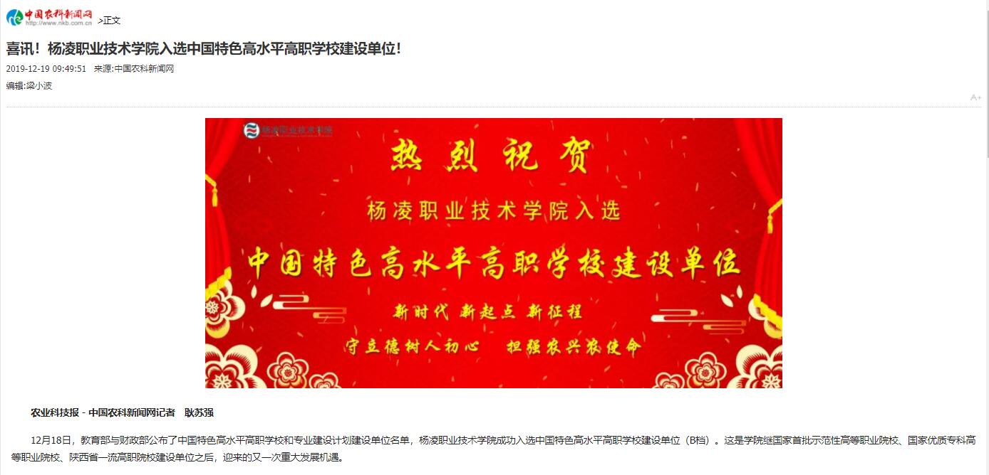 农业科技报-中国农科新闻网记者 耿苏强 12月18日,教育部与财政部公布了中国特色高水平高职学校和专业建设计划建设单位名单,杨凌职业技术学院成功入选中国特色高水平高职学校建设单位(B档)。这是学院继国家首批示范性高等职业院校、国家优质专科高等职业院校、陕西省一流高职院校建设单位之后,迎来的又一次重大发展机遇。