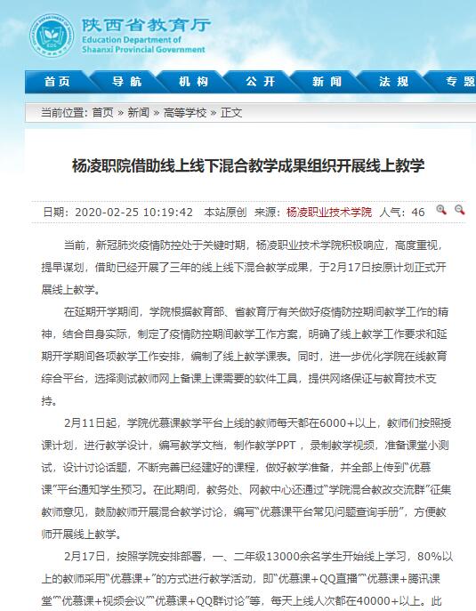 当前,新冠肺炎疫情防控处于关键时期,杨凌职业技术学院积极响应,高度重视,提早谋划,借助已经开展了三年的线上线下混合教学成果,于2月17日按原计划正式开展线上教学。