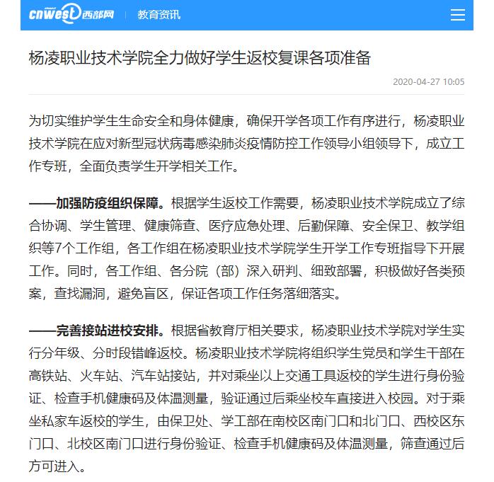 为切实维护学生生命安全和身体健康,确保开学各项工作有序进行,杨凌职业技术学院在应对新型冠状病毒感染肺炎疫情防控工作领导小组领导下,成立工作专班,全面负责学生开学相关工作。