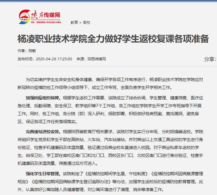 为切实维护学生生命安全和身体健康,确保开学各项工作有序进行,杨凌职业技术学院在学院应对新冠肺炎疫情防控工作领导小组领导下,成立工作专班,全面负责学生开学相关工作。