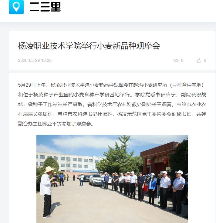 5月29日上午,杨凌职业技术学院小麦新品种观摩会在赵瑜小麦研究所(豆村育种基地)和位于杨凌种子产业园的小麦育种产学研基地举行。学院党委书记陈宁、副院长祝战斌,省种子工作站站长严勇敢,省科学技术厅农村科教处副处长王德喜,宝鸡市农业农村局局长张周让,宝鸡市农科院书记杜运科,杨凌示范区党工委管委会副秘书长、共建融合办主任陈亚平等参加了观摩会。