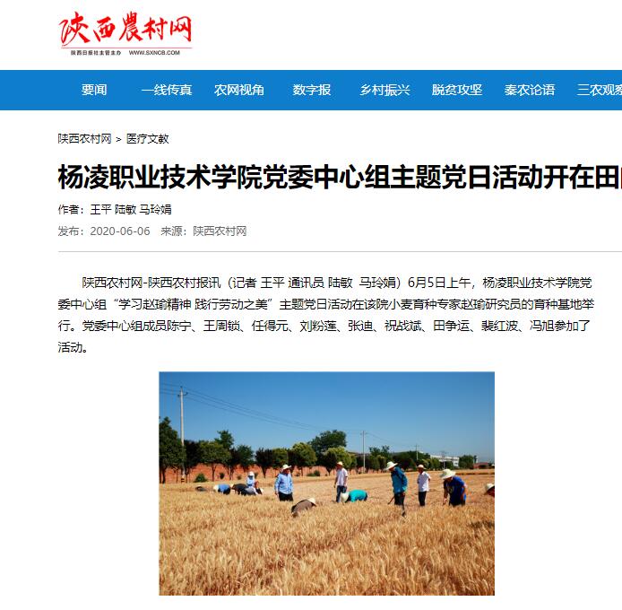 陕西农村网-陕西农村报讯(记者 王平 通讯员 陆敏 马玲娟)6月5日上午,杨凌职业技术学院党委中心组“学习赵瑜精神 践行劳动之美”主题党日活动在该院小麦育种专家赵瑜研究员的育种基地举行。党委中心组成员陈宁、王周锁、任得元、刘粉莲、张迪、祝战斌、田争运、裴红波、冯旭参加了活动。