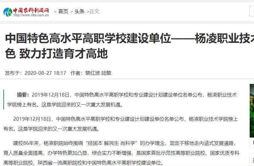 【中国农科新闻网】杨凌职业技术学院:抓内涵 强特色 致力打造育才高地
