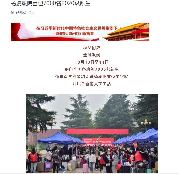 秋意初浓,金风飒飒。10月10日至11日,来自全国各地的7000名新生,带着青春的梦想走进杨凌职业技术学院,开启全新的大学生活。