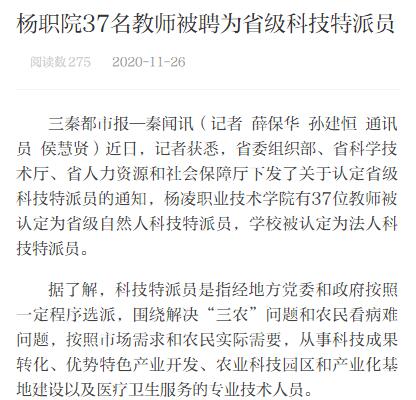 三秦都市报—秦闻讯(记者 薛保华 孙建恒 通讯员 侯慧贤)近日,记者获悉,省委组织部、省科学技术厅、省人力资源和社会保障厅下发了关于认定省级科技特派员的通知,杨凌职业技术学院有37位教师被认定为省级自然人科技特派员,学校被认定为法人科技特派员。