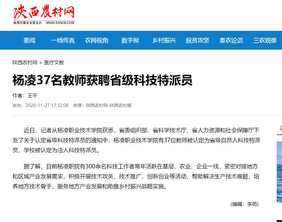 近日,记者从杨凌职业技术学院获悉,省委组织部、省科学技术厅、省人力资源和社会保障厅下发了关于认定省级科技特派员的通知中,杨凌职业技术学院有37位教师被认定为省级自然人科技特派员,学校被认定为法人科技特派员。