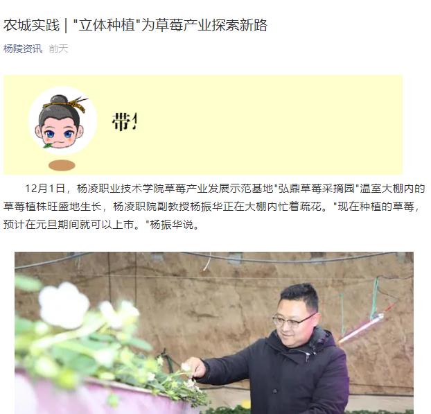 12月1日,杨凌职业技术学院草莓产业发展示范基地"弘鼎草莓采摘园"温室大棚内的草莓植株旺盛地生长,杨凌职院副教授杨振华正在大棚内忙着疏花。"现在种植的草莓,预计在元旦期间就可以上市。"杨振华说。