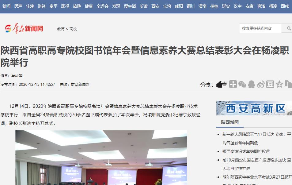 12月14日,2020年陕西省高职高专院校图书馆年会暨信息素养大赛总结表彰大会在杨凌职业技术学院举行,来自全省24所高职院校的70余名图书馆代表参加了本次年会。杨凌职院党委书记陈宁致欢迎词,副校长张迪主持开幕式。