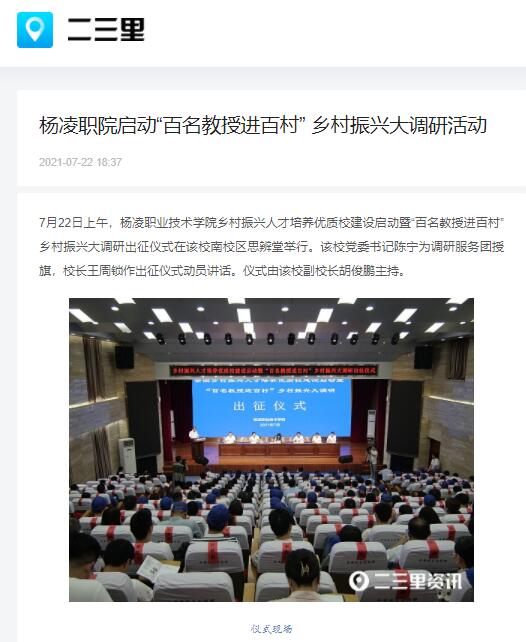 7月22日上午,杨凌职业技术学院乡村振兴人才培养优质校建设启动暨“百名教授进百村”乡村振兴大调研出征仪式在该校南校区思辨堂举行。该校党委书记陈宁为调研服务团授旗,校长王周锁作出征仪式动员讲话。仪式由该校副校长胡俊鹏主持。